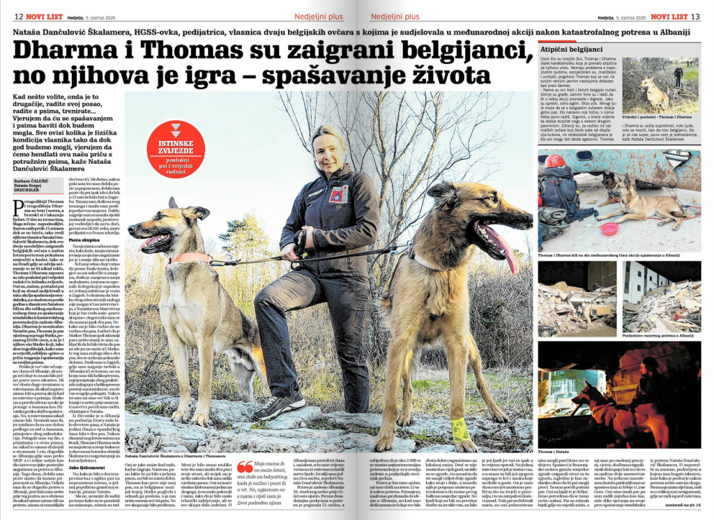 Noć nakon katastrofalnog potresa u Albaniji, iz Rijeke je prema Draču krenula Nataša Dančulović Škalamera s dvoje pasa, belgijskim ovčarima Dharmom i Thomasom. Oba su psa članovi Hrvatske gorske službe spašavanja obučeni za spašavanje iz ruševina. Zbog brzine koja je potrebna za spašavanje preživjelih iz ruševina, nije bilo vremena za pauziranje. Dok se jedan pas odmarao, radila je s