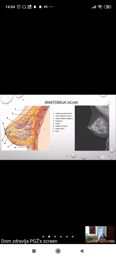 Dana 13.11.2020. održana je četvrta po redu online edukacija o samopregledu dojke. Edukaciju je održala Sabina Lenac Juranić, dr. med., spec. radiologije, patronažnim i medicinskim sestrama zdravstvene njege u kući te radiološkim tehničarima u ispostavi DZ PGŽ Rijeka. Zadnja edukacija zakazana je 27.11.2020., u 14,00 sati, te su pozvani svi zainteresirani zdravstveni djelatnici da se