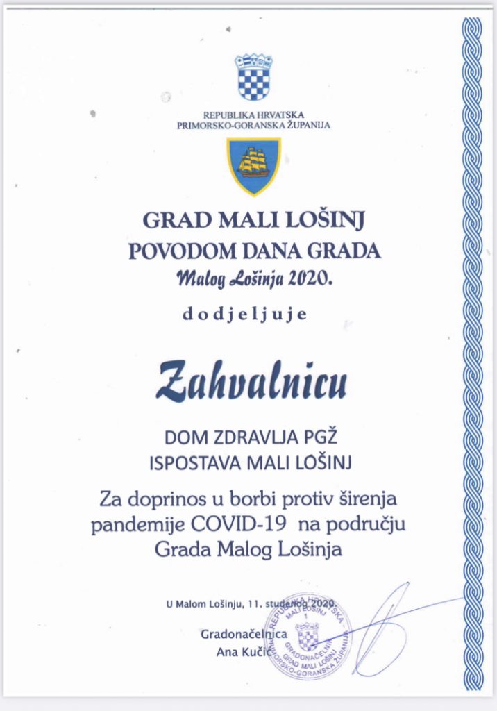Povodom dana Grada Malog Lošinja koji se obilježava 11. studenog, Ispostavi Mali Lošinj Doma zdravlja Primorsko-goranske županije dodijeljena je zahvalnica za doprinos u borbi protiv širenja pandemije COVID-19 na području grada Malog Lošinja . Zahvaljujemo se Gradu Malom Lošinju i našem timu u ispostavi Mali Lošinj.