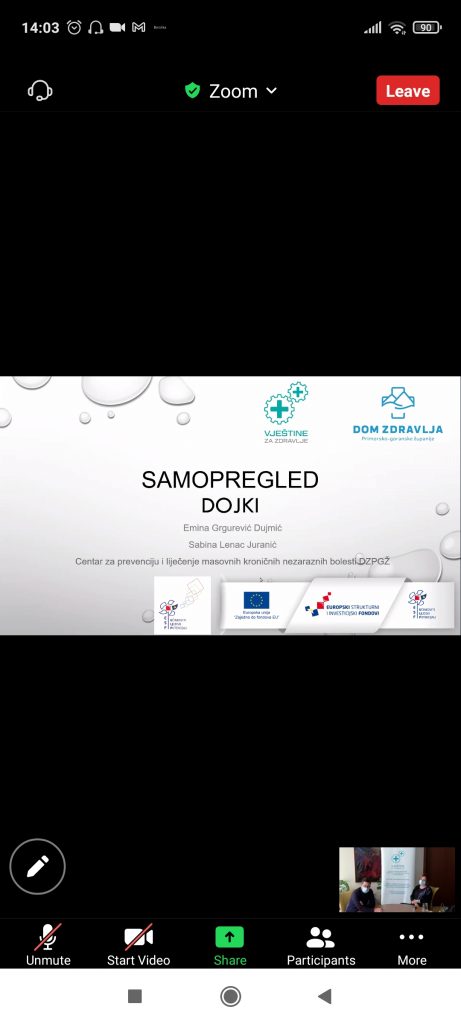 Dana 02.10.2020 u 14,00 sati održana je prva u nizu od 5 on-line edukacija o samopregledu dojke koje se provode u sklopu projekta “Vještine za zdravlje”. Edukaciju je održala Sabina Lenac Juranić, dr. med., spec. radiologije, patronažnim sestrama i medicinskim sestrama zdravstvene njege u kući u ispostavama Doma zdravlja PGŽ na otocima. Iduće edukacije zakazane