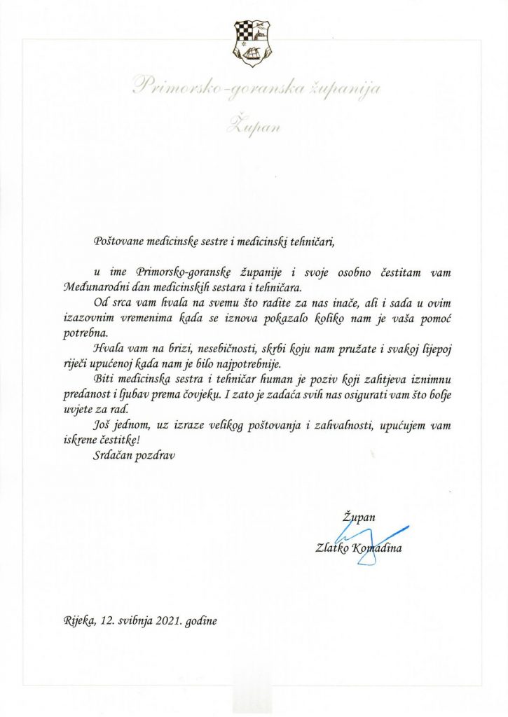 Župan Primorsko-goranske županije Zlatko Komadina i gradonačelnik grada Rijeke Vojko Obersnel čestitali su medicinskim sestrama i tehničarima Međunarodni dan sestrinstva. Grad Rijeka je tom prilikom medicinske sestre i tehničare nagradio obilaskom Šećerane, novog Muzeja grada Rijeke. Čestitke donosimo u nastavku.