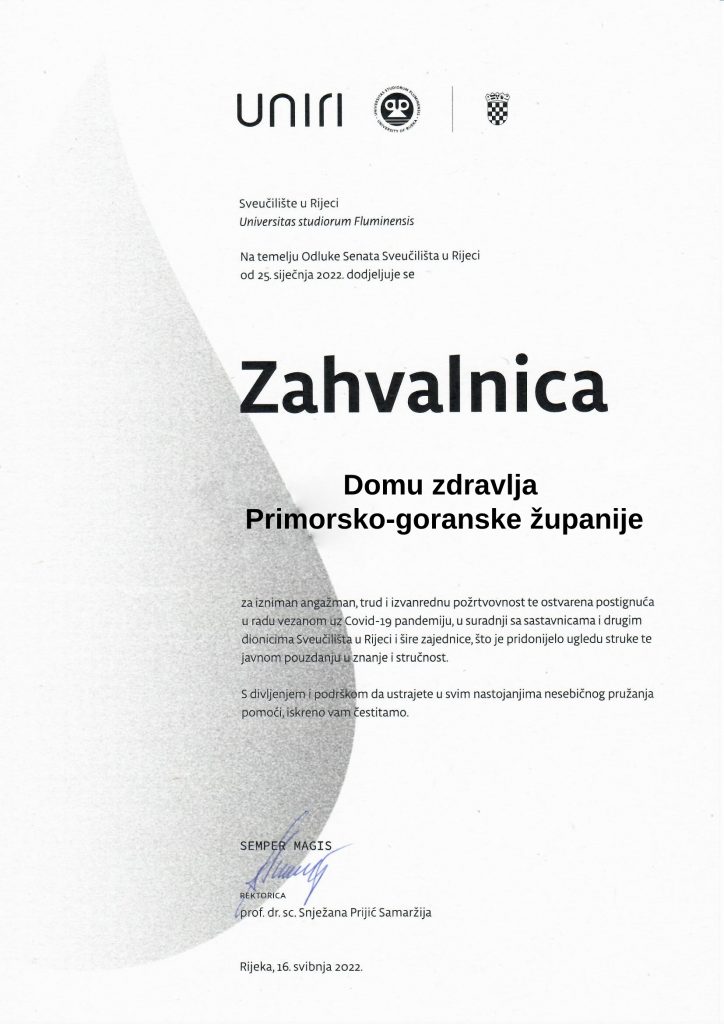 Sveučilište u Rijeci dodijelilo je Domu zdravlja Primorsko-goranske županije zahvalnicu za izniman angažman, trud i izvanrednu požrtvovnost te ostvarena postignuća u radu vezanom uz COVID-19 pandemiju. Ovim putem im se zahvaljujemo na dodijeljenom priznanju!
