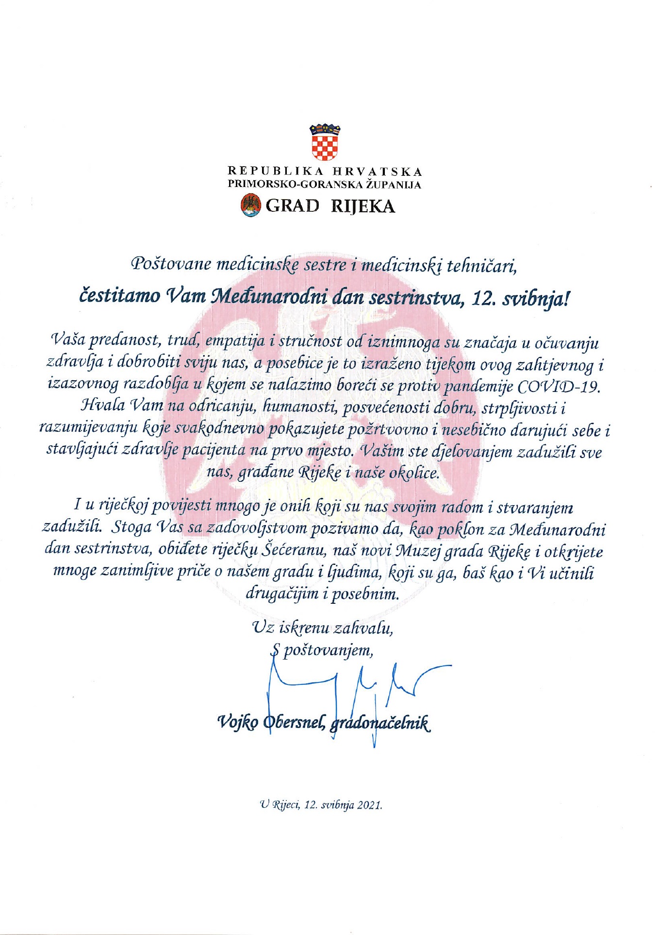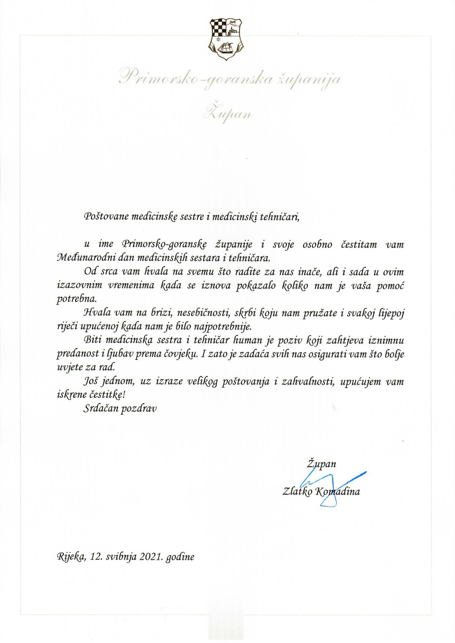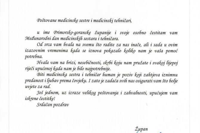 Župan Primorsko-goranske županije Zlatko Komadina i gradonačelnik grada Rijeke Vojko Obersnel čestitali su medicinskim sestrama i tehničarima Međunarodni dan sestrinstva.